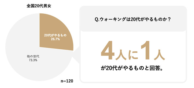 ウォーキングはどの世代がやるものだと思うか、という質問に対して、20代の4人に1人(26.7%)は「ウォーキングは20代(自分たちの世代)がやるもの」と回答。ウォーキングを積極的に自分事化し取り組む意識の存在が明らかになりました。