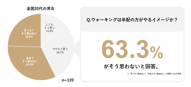 ウォーキングに対するイメージとして「年配の方がやるイメージがあるか」に対して20代は「そう思わない」と63.3%が回答。「20代がやるものだと思うか」に対しては他の年代が僅かに止まっていることに対し、20代は4人に1人が自分たちがやるものだと回答。ウォーキングを自分ごと化していることが明らかになりました。