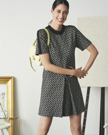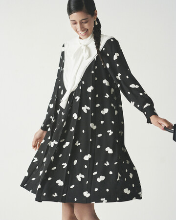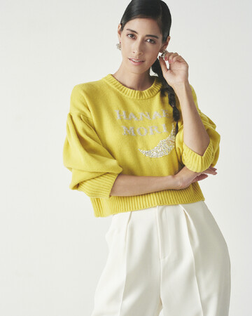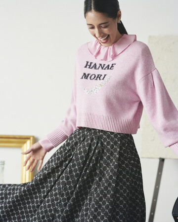 「今回のコラボは、着ていて元気が出る色鮮やかなアイテムがたくさん登場しています。インナーにブラウスを入れた遊びのあるスタイルも楽しめるニットプルオーバーや、エレガントなリボン付きワンピース(いちばんのお気に入り!)など、コーディネートをするのが楽しくなるものばかり。HANAE MORIの象徴であるバタフライやムーン柄など、懐かしくキャッチーなモチーフにも注目です」
