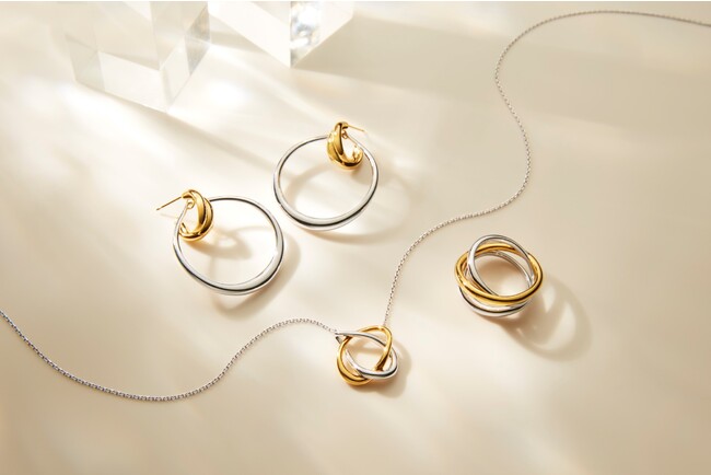 しずくや水面の波紋をイメージした、美しい曲線のフォルムを重ねたデザインは、トレンドのコンビカラーが映え、モダンな印象に。合わせるジュエリーのカラーを選ばないので、様々なコーディネートにしっくりなじみます。耳の形に添って抑揚をつけてカーブする二連風のイヤーカフなど、種類豊富なイヤーアイテムは、あなたの耳元を魅惑的に彩ります。