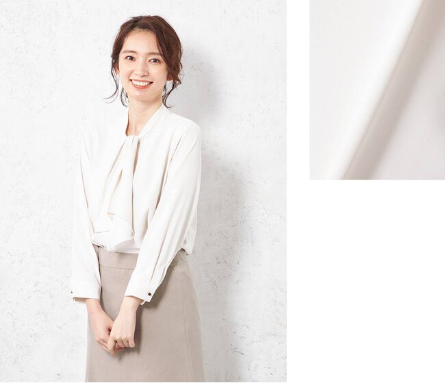 『Cassette Crossシリーズ』のセットアップは上下同デザインを合わせてスーツスタイルとしての着用はもちろんのこと、ジャケットとボトムをデザイン違いで組み合わせることでキレイめなオフィスカジュアルスタイルも叶う簡単スタイリングセットアップです。同シリーズのブラウスは、フロント部分にタイやラッフルなどアクセントを持ってきた華やかなデザインでパンツスタイル、スカートスタイルのどちらにもマッチします。