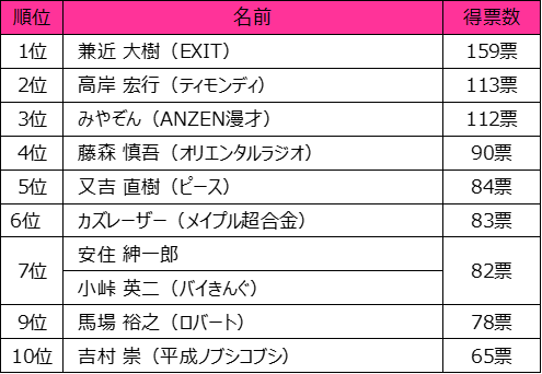 芸人・タレント・アナウンサー部門では7位の安住 紳一郎さん以外は全て芸人がランクインする結果となりました。1位はEXITの兼近 大樹さん。「チャラいキャラクターに見えて根は真面目そう」という意見が多く聞かれました。2位は明るくいつも前向きなイメージがあるティモンディの高岸 宏行さん。フリーコメントでも「ポジティブでいてくれそう」という意見が多くありました。3位には「優しそう」という意見が多く集まったANZEN漫才のみやぞんさんがランクインしました。また、唯一芸人以外からランクインした7位の安住 紳一郎さんはアナウンサーとしてスマートに仕事をしている姿から、「知的だから」、「しっかりしていそうだから」などという理由で選ばれました。