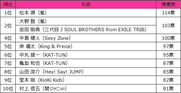アーティスト・アイドル部門では2位の岩田 剛典さん以外は全てジャニーズの皆さんがランクインしました。1位は嵐の松本 潤さん。「かっこいい夫になりそう」という意見が多く聞かれました。2位には同じく嵐の大野 智さんがランクイン。「優しそうでおおらかそう」などのコメントが多く、TVから伝わる大野さんの穏やかなイメージがランキングに反映されていました。また、同じく2位の三代目J SOUL BROTHERS from EXILE TRIBの岩田 剛典さんは「知的だから」という理由が多く見受けられました。