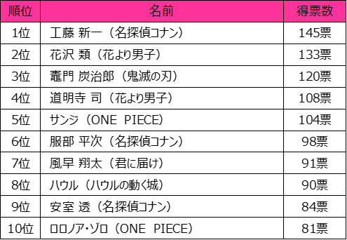 アニメキャラクター部門の1位に輝いたのは『名探偵コナン』の工藤 新一でした。幼なじみの毛利 蘭を一途に思う姿から「いい夫になりそう」という声が多く聞かれました。2位は実写版のドラマでは小栗 旬さんがかっこよく演じられた印象も残る『花より男子』の花沢 類がランクイン。ヒロインの牧野 つくしに対する「包み込むような優しさにひかれたから」という理由が多く見受けられました。3位の『鬼滅の刃』の主人公、竈門 炭治郎はやはり妹や家族、仲間を思い戦う炭治郎の姿から「家族を大切にしてくれそう」というイメージにつながったようです。