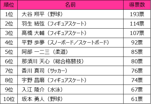 スポーツ選手部門では世界で大人気で同い年でもある大谷 翔平選手と羽生 結弦さんがTOP2に輝きました。お二人とも「何事にも真摯で誠実そうだから」という理由が多く聞かれました。また、3位に高橋 大輔選手、8位に宇野 昌磨選手とフィギュアスケートの選手がTOP10に最も多くランクインするという結果になりました。