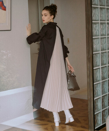 バックスタイルにレイヤールックなドレーププリーツを施したスタンドカラーワンピース。