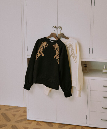 ロキトのアイコンとなっているコード刺繍をラグランのラインに合わせて前身頃に施したデザイン。上品な素材を使用し、刺繍を組み合わせることでモード感のあるトップスに仕上げている。