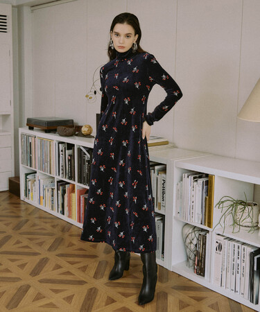 FLORAL VELOUR JACQUARD HIGH NECK DRESS