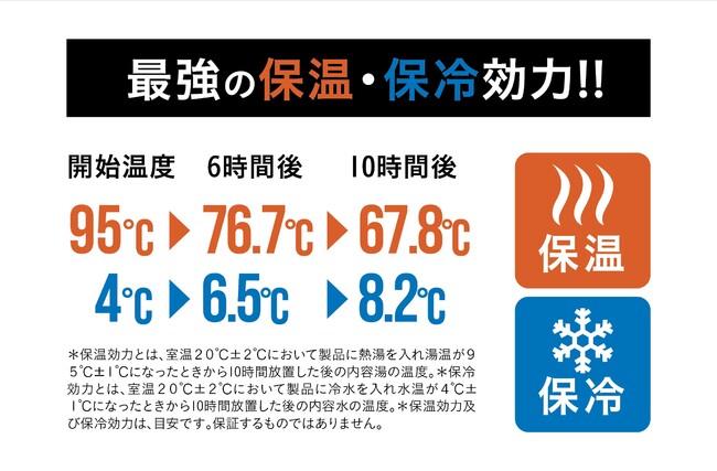 保温/保冷効力が極めて高いので、寒い冬は飲み物の温かさをキープし、暑い夏は冷たい飲み物を長い時間美味しく頂けます。