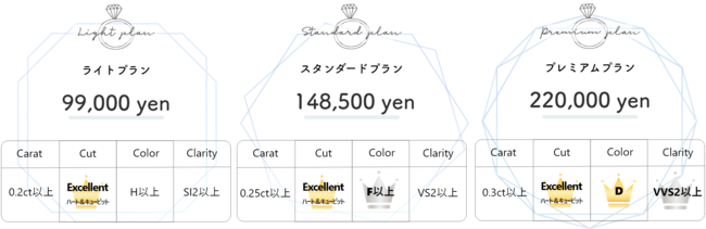 ダイヤモンドのグレードや価格など、「わかりにくい・聞きにくい」を明確化して選びやすい3コースに。