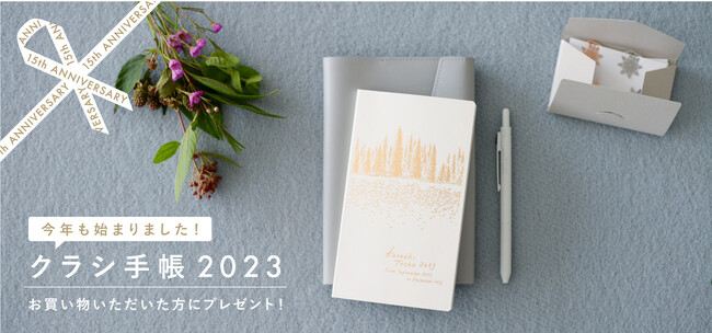 「『 “好き” が見つかる、広がる』ちいさなガラスの花びん」の発売に合わせて、15周年感謝祭と題したキャンペーンも開始。2022年10月14日(金)まで15周年記念を含めた5000円以上購入で送料無料になります。また、全ての商品購入に、15周年メインビジュアルと同じmiltata氏によるイラストがゴールドの箔で描かれた「クラシ手帳2023」が同梱されます。