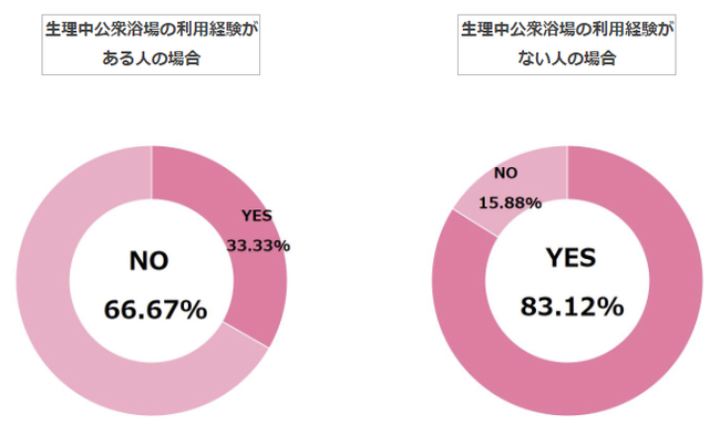 生理中に公衆浴場を利用するか否かについては、利用したことがあるという人が15%と圧倒的に少ないという結果に。 昨年の調査でも利用するという人が22%でしたので、多くの方がやはり生理中の温泉利用はNGと捉えていると言えるでしょう。