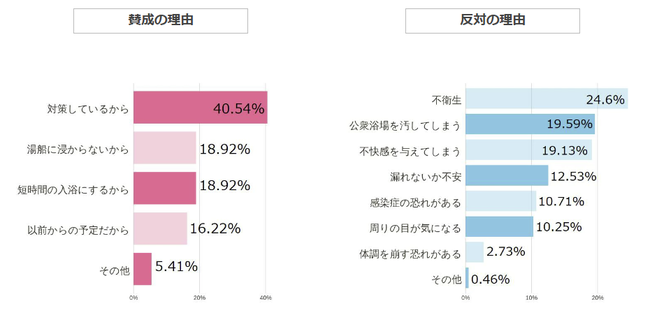 それぞれの意見の理由としては、賛成派はしっかり対策しているからという意見が4割で圧倒的です。その他の意見としては、家にお風呂がない場合は仕方ない、といった理由も見られました。 反対派の理由は、不衛生とのことで、こちらに関しては自身の体に対しても不衛生だし、汚してしまって不衛生といったことにも捉えられ両面での意見がありそうです。