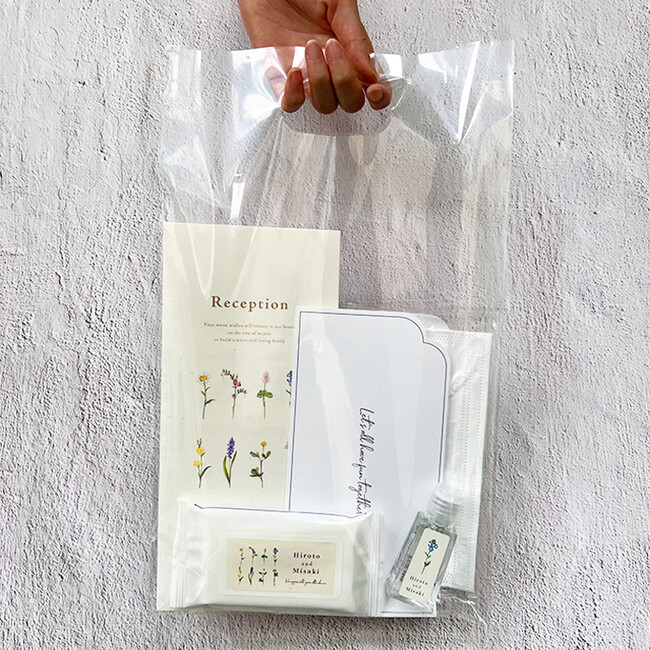 専用袋もセットになっているので、ご自身でシールを貼るだけでオリジナル対策グッズとしてゲストにお渡しいただけます。