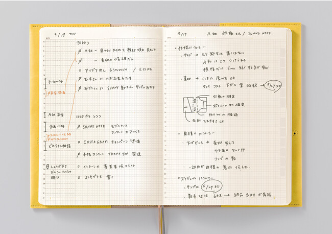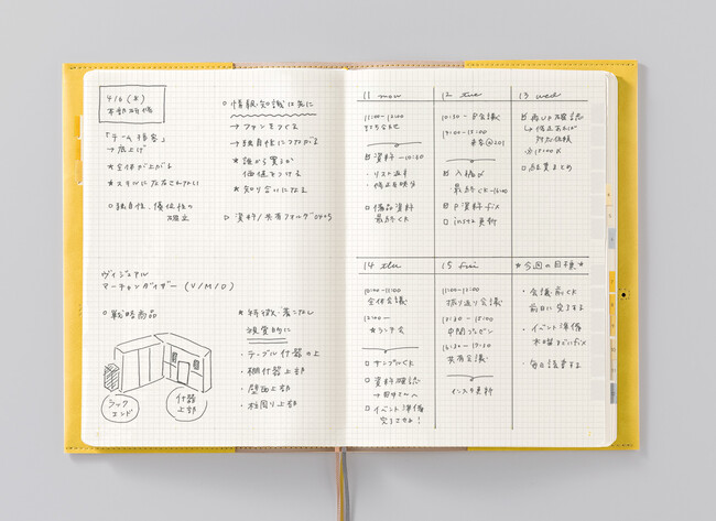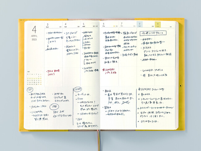 1週間につき見開き1ページ以上使える111ページのノート。片面を2分割または3分割しやすい「方眼スプリットノート」で、従来のマンスリー手帳を超えた自由度の高い使い心地です。