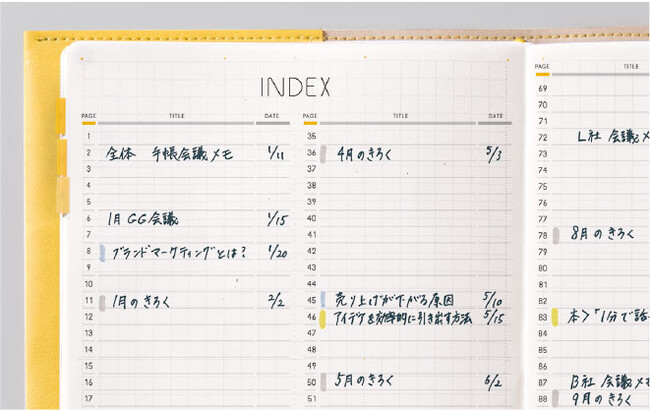 ノートページの始めには、“目次”として使えるインデックスページを収録。あらかじめページ番号が振られてあるフォーマットのため、ノートを書き始める前から構成を考える必要はありません。 自由にノートを書き進めて、「後で見返したい」というページにだけ、タイトルを書き込んで使います。