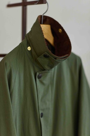 身幅、アームホールを全体的にオーバーサイズにモダナイズしたシルエット、スタンドカラーで着用できる衿デザイン、素材もオイルドからコーデュラナイロンのウェザークロスに変更と、ミニマムかつシティなルックスに仕上げました。