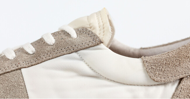秋の旅行の足元を彩る大人のスニーカー 切り返したナイロンはコシがある半光沢の国内製ツイルナイロンを採用。スポーティな印象があるオックス(平織)ではなく、パンツなどで用いられるツイル(綾織)はボトムスとの相性を考えて採用している。その切り返しの位地は数ミリ単位の調整を行い、前後の素材感、靴下とのマッチングが最適と思われる位置を見つけ出すため、幾度も試作を繰り返して完成させた一足。派手さはないが、細かなところまで考え抜かれて作られて、まさに大人のためのスニーカーとなっている。