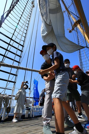 ■海と帆船に親しむアクティビティに歓声があがる