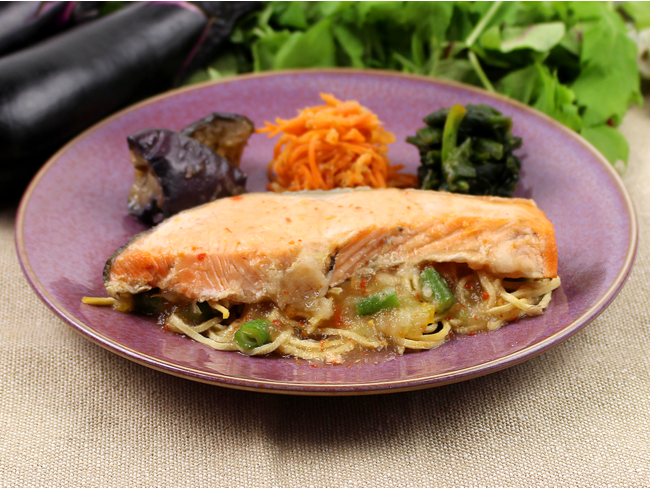 ローストした鮭にネギ油香る豆腐干と香味野菜の和えものを添えて、鶏ガラ味の中華あんに発酵唐辛子を混ぜたソースをかけました。豆腐干は和え麺のようになっておりますのでシメにお召し上がりください。