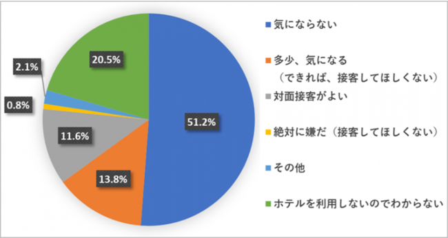 ホテルの対面接客に関しては、2人に1人が「気にならない」という回答がみられました。次いで、「多少気になる」と回答した人が13.8%、「対面接客がよい」と回答した人が11.6%という回答になりました。
