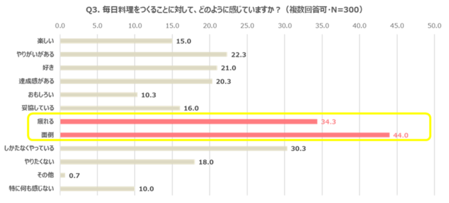 料理をする半数以上の人が、「毎日料理をつくることが愛」と考えつつも、毎日料理をつくることに対して、実際には「疲れる」(34.3%)や「面倒」(44.0%)と感じてしまっている人も多いことがわかりました。この結果は、「楽しい」(15.0%)や「やりがいがある」(22.3%)などのポジティブな回答に比べると約2倍近い数字となっています。