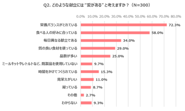 ・ 愛があると思う献立:「栄養バランスがとれている」(72.3%)、「食べる人の好みに合っている」(58.0%)が上位