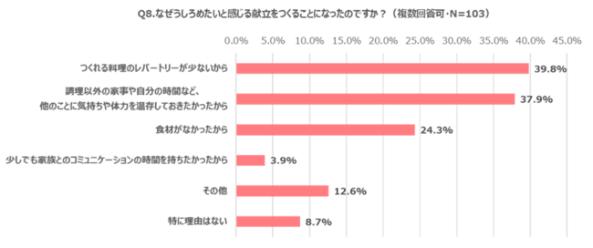 色々な思いを抱えてつくる料理ですが、実は自分の献立に“うしろめたさ”を覚える経験を、約3割以上の人がしていることがわかりました。“うしろめたさ”を覚えた理由としては、「品数が少ないから」(48.5%)、「凝った料理がつくれないから」(46.6%)などがあがっています。また、なぜそのよな “うしろめたさ”を覚える献立になってしまったのか、という質問に対しては「つくれる料理のレパートリーが少ないから」(39.8%)と、「調理以外の家事や自分の時間など、他のことに気持ちや体力を温存しておきたかったから」(37.9%)という理由があげられました。思っていたような料理をつくれない理想とのギャップや、他のこともしたいという気持ちと現実との乖離が、“うしろめたさ”を生んでしまっているようです。
