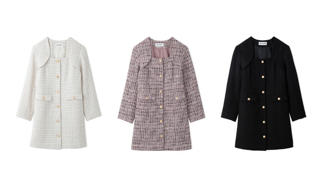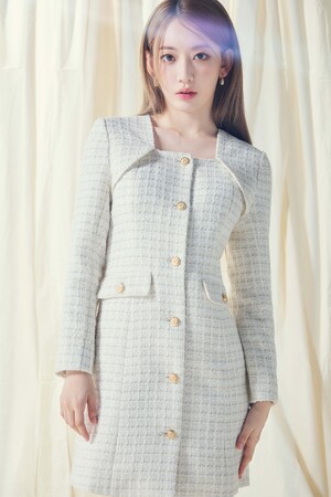 ジャケットを羽織っているかのようなディテールや上品なラメが織り込まれたオリジナルのツイード生地、