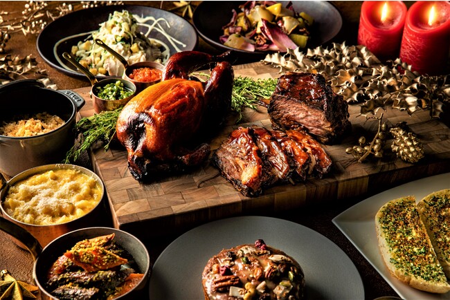 自家製ビーフリブ・サルサロハ / ホールチキンのロースト・ジンジャー&グリーンシャロットレリッシュ / クラブ&プラウン マッケンチーズ / グレイズドキャロット・ピスタチオデュカ / XO醬バターライス / ガーリックトースト / クリスマスプディング・酒粕アングレーズ