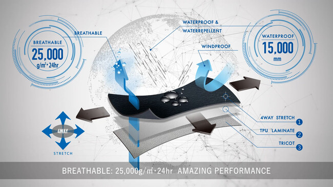 さらに外からの雨を防ぎながら同時に衣服内の湿気(水蒸気)を外へ排出する「防水透湿生地」なので、汗による衣服内の蒸れを軽減し、衣服内を快適に。その蒸れにくさの指数である透湿性は驚異の「透湿度25,000g/平方メートル ・24hr」を実現しています。