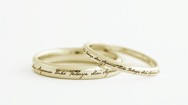大切な人の名前や、家族・ペット。誓いの言葉や詩の一節など、2つ~4つの単語(例えばお名前等)をリング一周に繰り返しお入れする仕様となります。