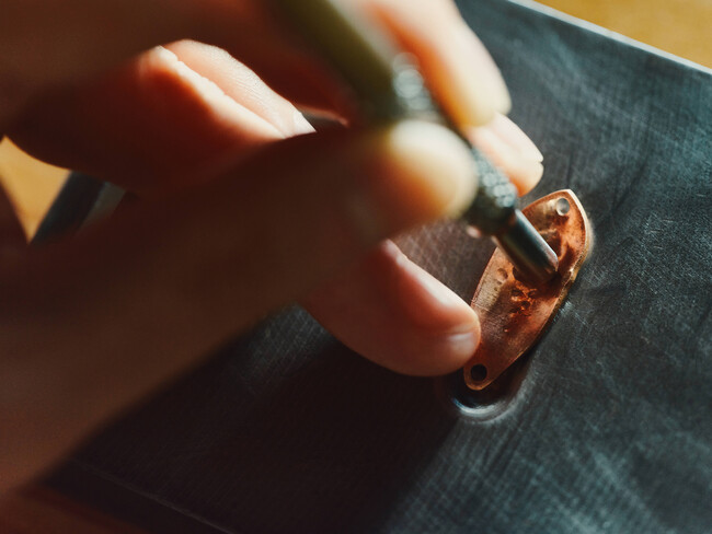 太さや角の大きさの違う2種類のSTICKとハンマーを使って、スプーンルアーのもととなるCHIPを叩いて形作っていきます。CHIPは銅板製なので、加工がしやすく、はじめての方でも簡単にスプーンルアーを作ることができます。