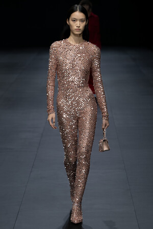 ヴァレンティノのクチュールメゾンとしてのコードはフォーマルウェアに落とし込まれ、コートやパンツ、タキシード、オーバーサイズジャケット、アウターウェアの構造に組み込まれています。刺繍、フェザー、ロマンティックなファブリックの組み合わせが都会的なアティテュードで表現され、現代的でスタイリッシュなテーラリングに昇華されています。クラシックなスーツの伝統はヴァレンティノのクチュールのコンセプトであるボリュームやミニマリズム、ピュアなフォルムによって再解釈され、インクルーシブなプロセスを経て新たな方法で表現されています。