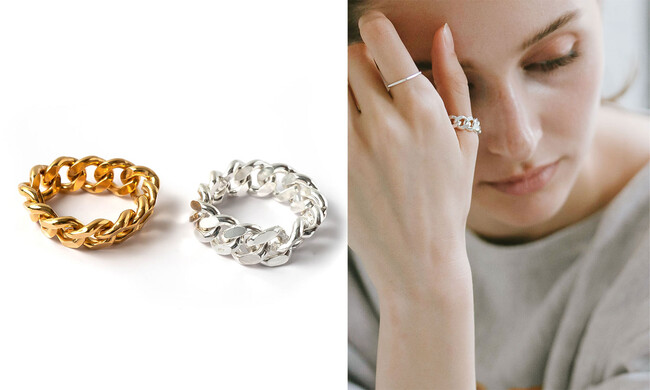 程よくゴージャスな雰囲気を纏い、コーデにパンチを効かせることができるチェーンリング。シンプル・ミニマルな装いにも適度なアピールが加わり、クールでグラマラスな印象に。