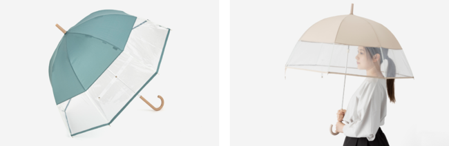 撥水生地とビニールを組み合わせることで、生地の撥水力とビニール傘の透明で前が見えやすいメリットを掛け合わせたハイブリッド傘です。一般的な傘よりも深いドーム型になる形状で、肩まですっぽりと覆ってくれ、深く差しても前が見えやすく、安全性も考慮したデザインが特徴です。手元には抗菌加工を施した樹脂を使用しています。