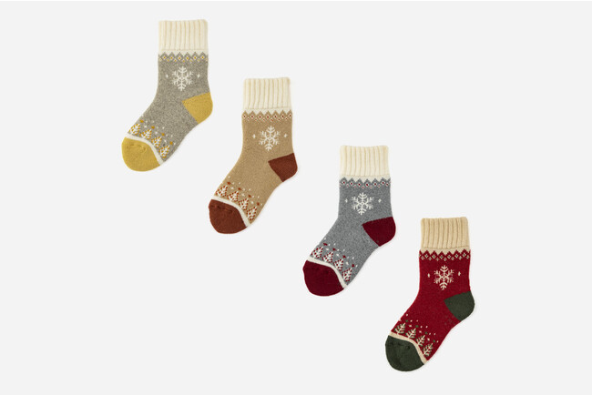 定番の雪柄は、履き口にラインが入ったデザインにリニューアル。ベース以外に2色の柄糸を使うことで、シンプルながらも華やかな印象に仕上げています。キッズサイズはトナカイのモチーフ入りの特別デザインで、親子コーデも楽しめます。