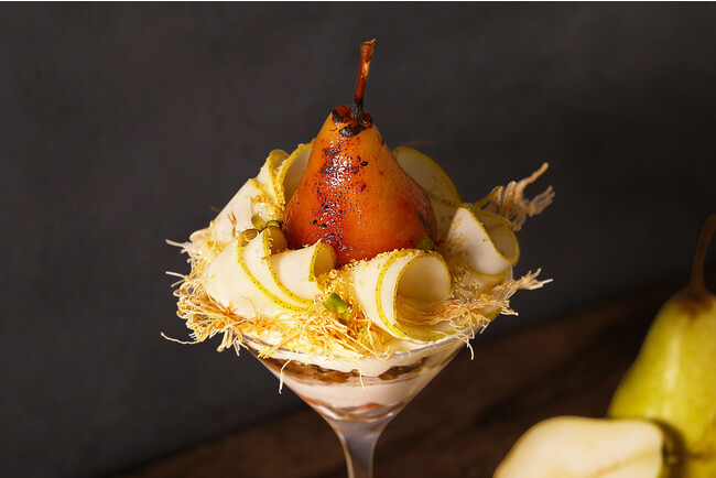 シャキッとフレッシュなスライス果実と、パリパリ食感が心地いいカダイフを纏い、ラ・フランスにしかない妖美な香りと上品な甘みのコンポートが引き立つよう仕立てました。