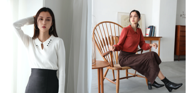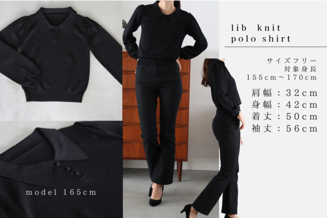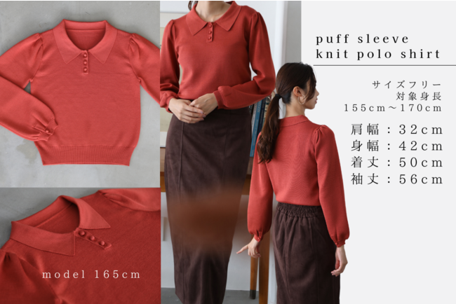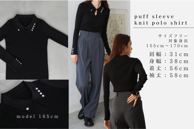 画像右:パフスリーブニットポロ(黒/オレンジ) ¥12,800(税込)