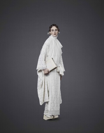 今回の新作は、フランス製の高級リバーレースで仕立てたレース振袖や、レースにレースを重ねて仕立てた振袖、補正や帯から解放し本来の身体の美しいラインを引き出すスカート調の袴などがラインナップ。おそろいのレースでつくったロングマントやケープ、帯、飾りリボン、ぽっくり、バッグなども取り揃えています。