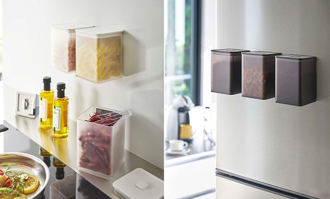 マグネットが付くキッチンパネルに簡単収納できるキャニスター。