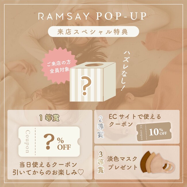 ラムジーの魅力ポイントである「低価格なのに高品質」であることをお手に取って生地などの肌触りをご体験いただける機会になるため、パーソナルカラーチェック、淡色コーデで自分らしいカラーを見つけていただきたいです。また、ポップアップ会場へ訪れた方には嬉しい特典も多数ご用意しております。