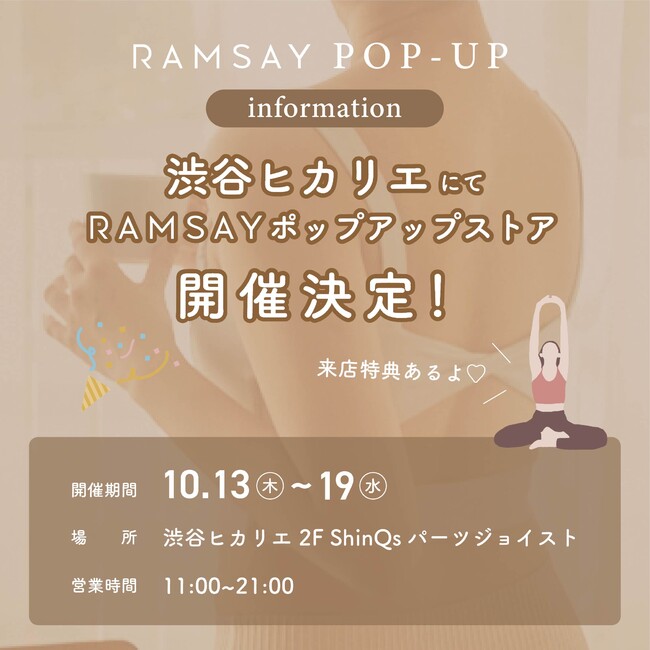 スポーツファッションブランド運営・製造業を展開する、株式会社Nolook(本社:東京都港区、代表取締役社長:平海諒平)は、株式会社MERY(本社:東京都千代田区、代表取締役社長:藤田 欣司)と「ヨガを自分色に染めよう」をブランドコンセプトに、ヨガ&ピラティスウェアブランド「RAMSAY」のポップアップイベントを、2022年10月13日(木)~2022年10月19日(水)までの期間限定で、初の渋谷ヒカリエにて開催します。