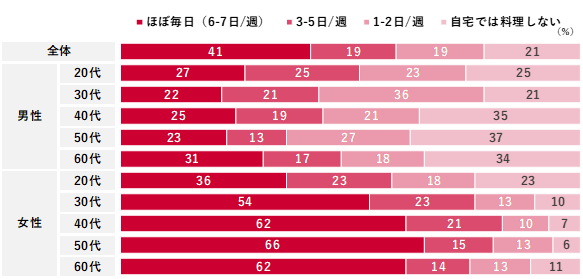 料理頻度は全体で「ほぼ毎日」が41%で最多となった。性年代別でみると、男性に比べて女性の方が「ほぼ毎日」が多かった。女性40代以上では「ほぼ毎日」が60%以上となった一方、男性40代以上は「自宅では料理しない」が最も高い結果となった。