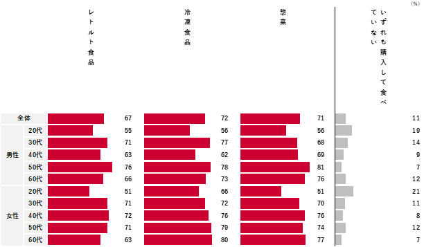 加工食品3種の利用状況について、全体ではレトルト食品は67%、冷凍食品は72%、惣菜は71%が利用していると回答した。性年代別にみると、20代の男性・女性ともに低い結果となった。