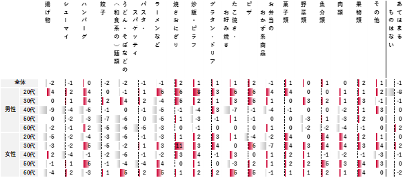 レトルト食品では「シチュー」「丼もの類の素」が高く、特に「シチュー」は女性50代以上で需要が期待されることがうかがえる。冷凍食品では「焼きおにぎり」「ピザ」「果物類」が高い。性年代別でみると、男性20代は「ラーメン」「焼きおにぎり」「炒飯・ピラフ」「たこ焼き・お好み焼き」「ピザ」など主食系の需要が高い。惣菜では男性20代、女性30代・50代で、幅広い品目において需要が高く、市場の期待性があると考えられる。