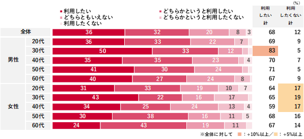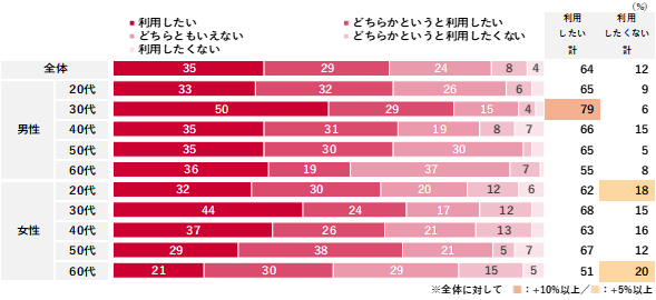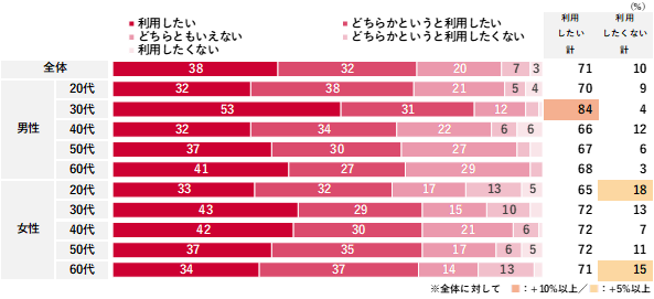 また、今後の利用意向について、レトルト食品は64%、冷凍食品は71%、惣菜は68%が利用したいと回答した。性年代別にみると、いずれの食品も男性30代で利用意向が80%前後と高かった。