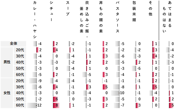 レトルト食品、冷凍食品、惣菜の品目ごとに、需要の見込まれる性年代が異なる