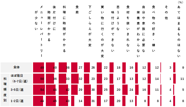 料理に関する悩みでは、全体で「メニューレパートリーが少ない」が49%で最も高く、次いで「後片付けに時間がかかる(40%)」、「料理に時間がかかる(38%)」と続く。料理頻度別でも上位3つの項目に変化はみられなかった。