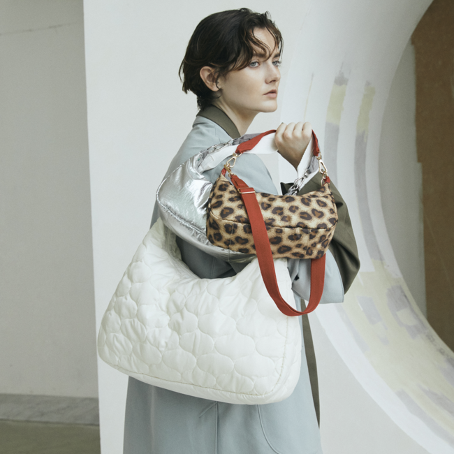 ラージ、スモールの2サイズ展開のショルダーバッグ。スモールサイズは取り外し可能なショルダー付き2WAY仕様。レオパード、カモフラージュなどの柄に加え、シルバーホイルやキルティングなど、着こなしをアップさせる存在感のあるデザインに。